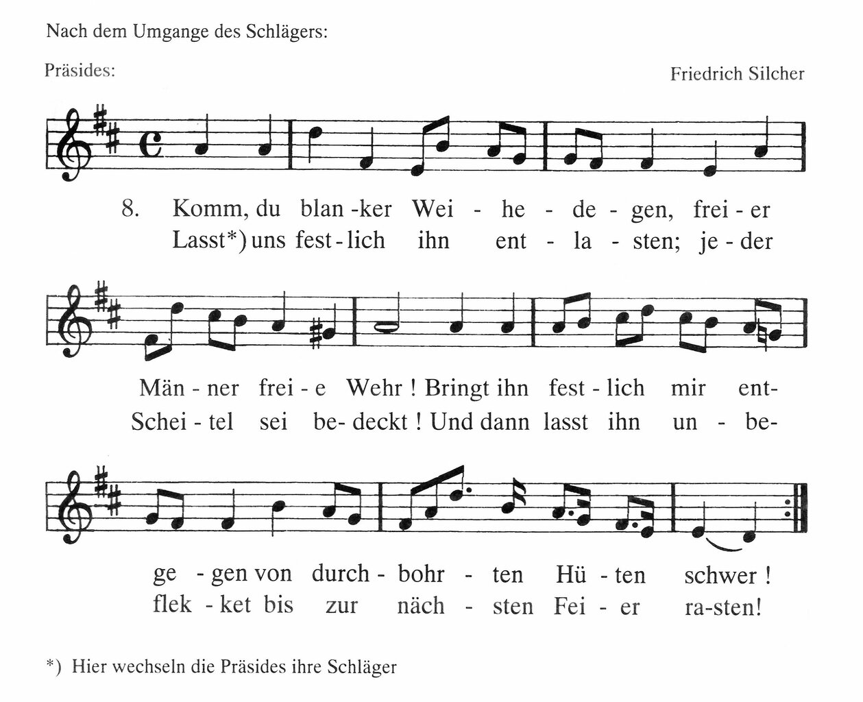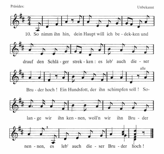 Diese beiden vorhergehenden Strophen werden bis zu beendetem Umgange der Schläger gesungen – danach: